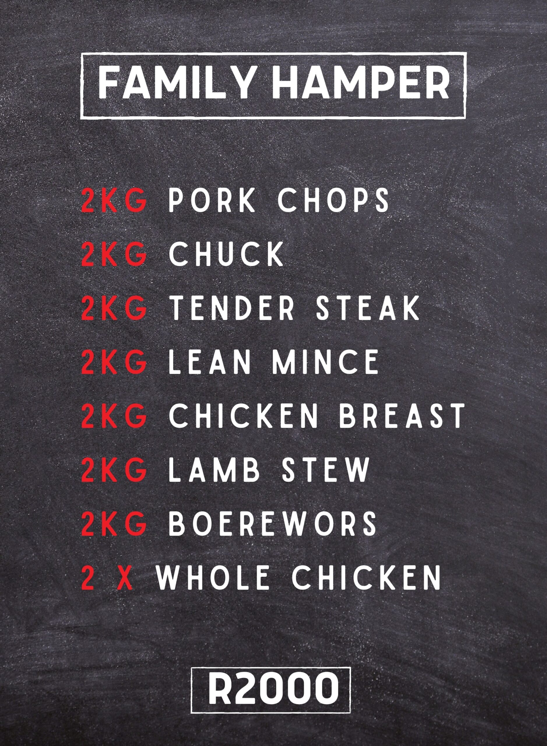 2KG Beef Goulash 2KG Chuck 2KG Tenderized Steak 2KG Lean Mince 2KG Chicken Breast 2KG Lamb Stew 2KG Boerewors 2 Whole Chickens